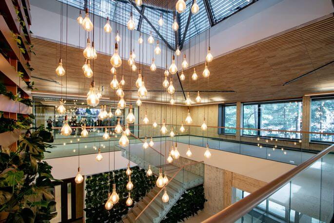 The new building also features a smart lighting system that uses up to 80 % of the natural light. The building also boasts a recuperation ventilation system that will channel out the air, but recuperate the heat. It also has a heating system with a sewage wastewater heat exchanger; and the green wall in the atrium will be watered with the collected rainwater. Furthermore, solar panels have been installed on the steel structures above the car park to locally generate power.