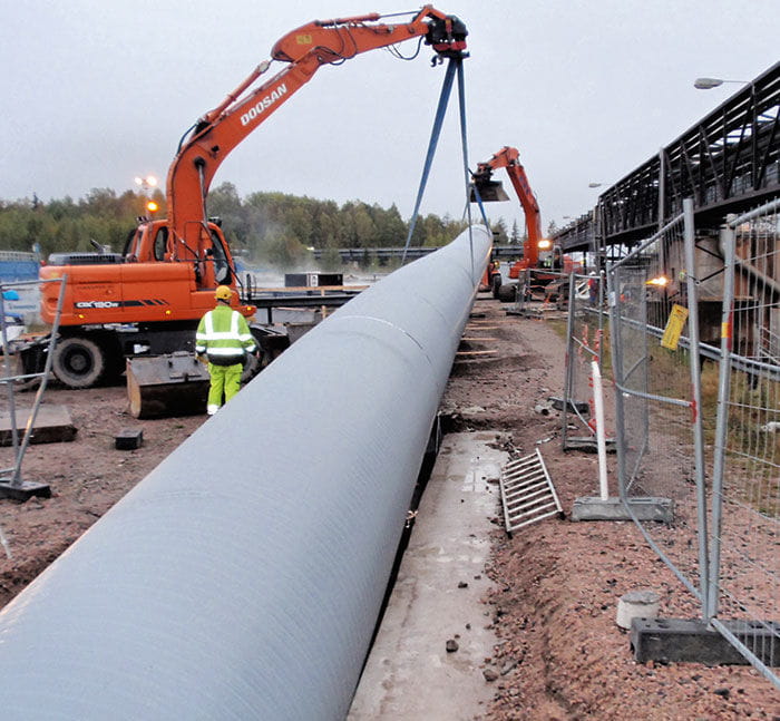 Excavators then pushed the piping into the concrete channel. According to Mr Sjöman and Mr Tiilikainen, the installation was completed successfully and within the agreed timeframe. However, there were small setbacks during commissioning, when a small leak was observed in an inspection chamber. The cause of this leak was fixed by sealing up the welding seams. Everything was ready for the project’s second sta